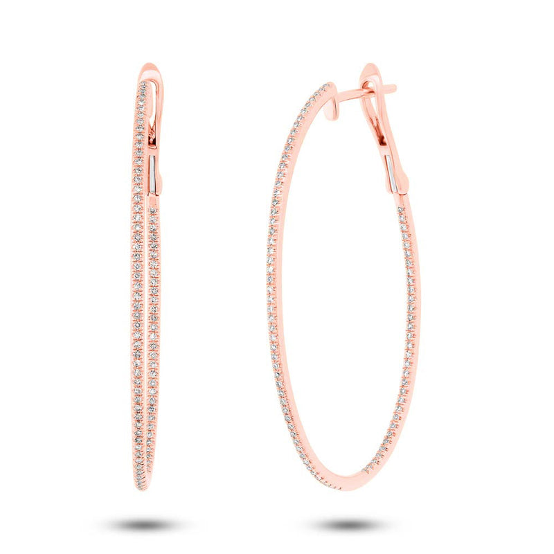 Here is a lovely pair of oval hoop earrings with presence and size. They are set with 0.44ct round cut diamonds on 14k rose gold and measure 1.75”  x 1.15”.