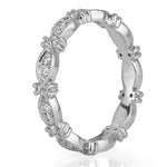 This beautiful custom-made diamond eternity band features a lovely eternity filigree design. It is handcrafted with delicate miligrain details throughout in an 18k white gold setting. There are 0.45ct of round brilliant cut diamonds accents set all the way around. This wedding band design can be custom created in platinum, yellow or rose gold!