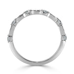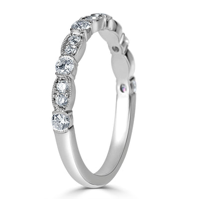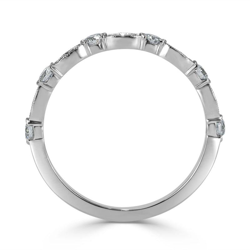 Step off the path of tradition with this interesting milgrain diamond wedding band. The slender 18k white gold ring has a ladylike top view and will couple well with any engagement ring. It is set with 0.45 carats of round brilliant cut diamonds.