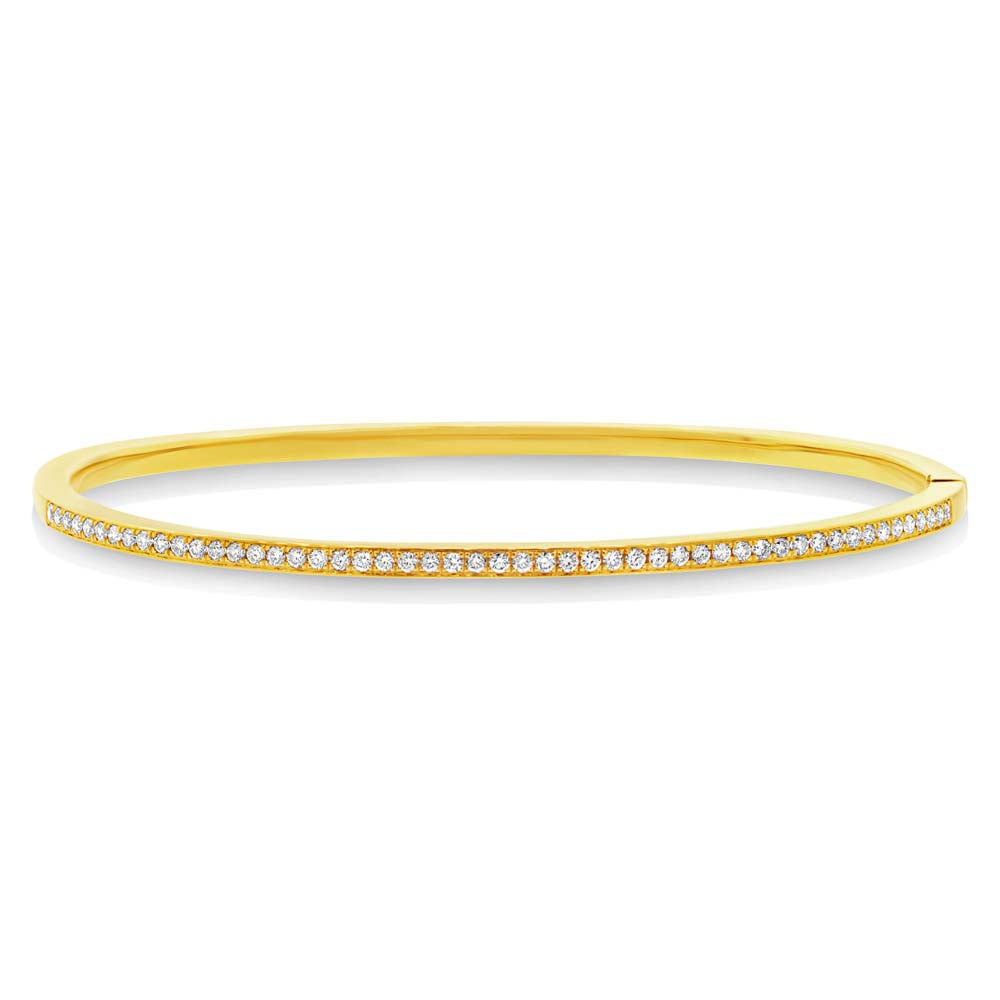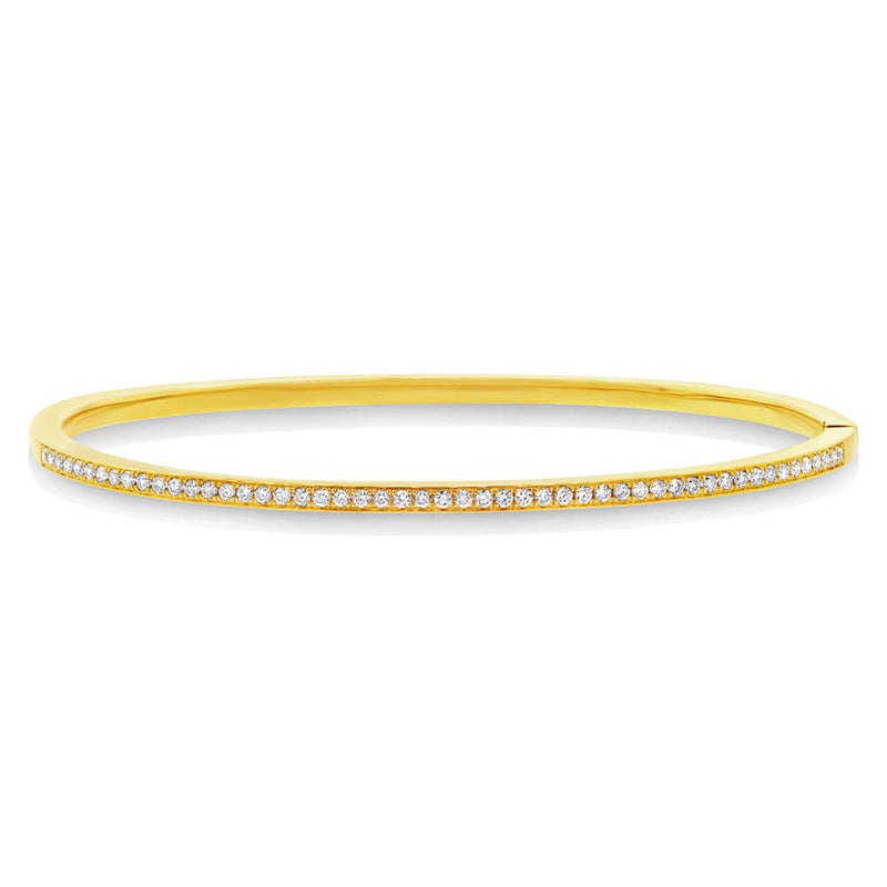 This wide, 14k gold bangle is chic and modern. It is set with 0.47ct round cut diamonds on a rich gold. It has a smooth hinge for easy wear and removal.