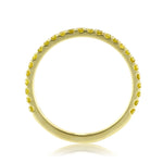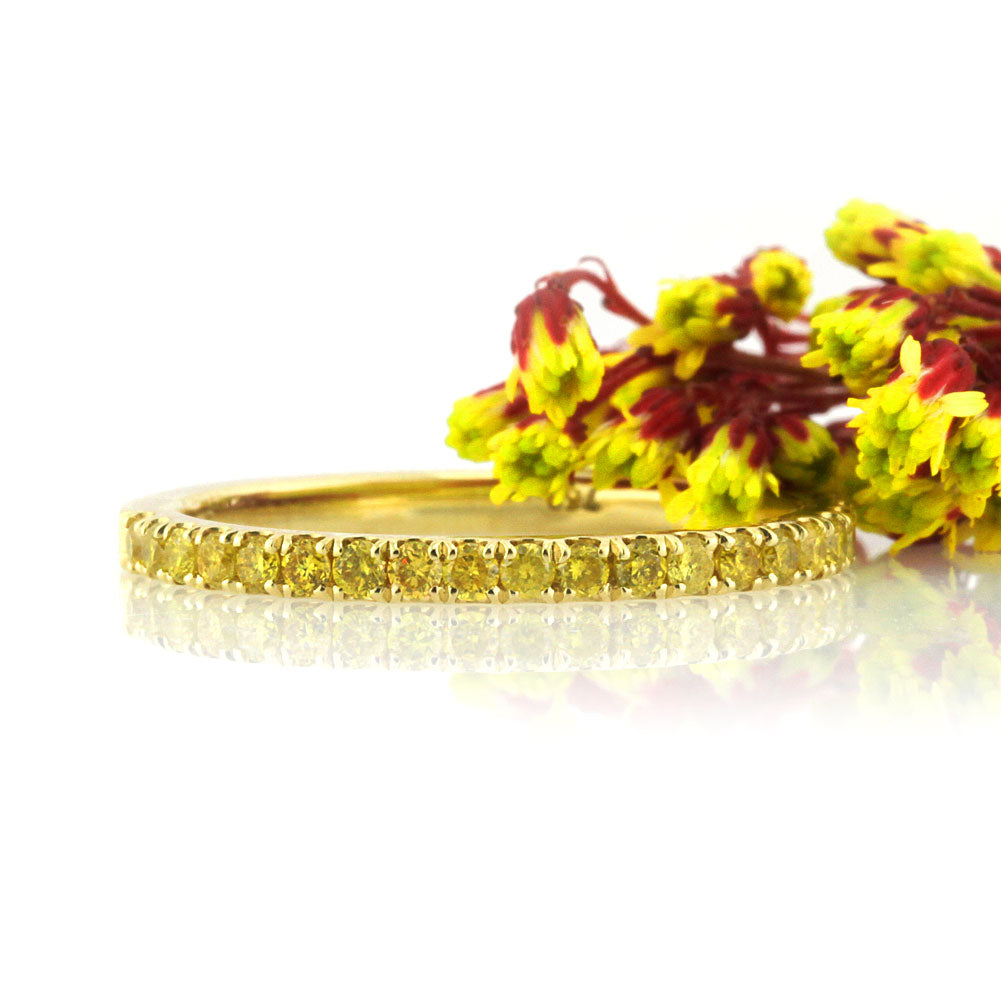 This one of a kind wedding band features 0.50ct of fancy yellow round brilliant cut diamonds in a micropave setting. The diamonds go just past halfway and will look fantastic worn alone or paired with your fancy yellow diamond engagement ring. This band can also be custom made to in white, yellow, or rose gold or platinum.