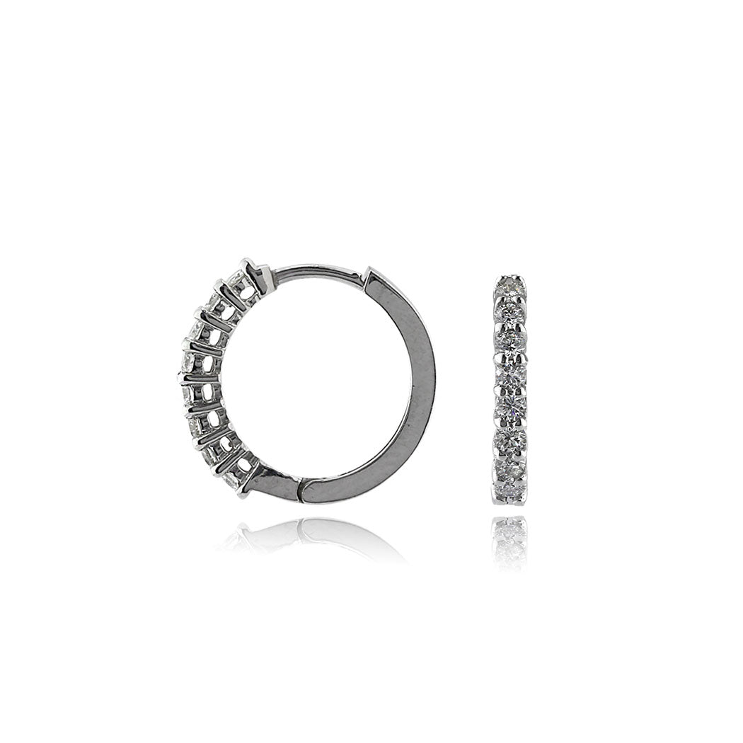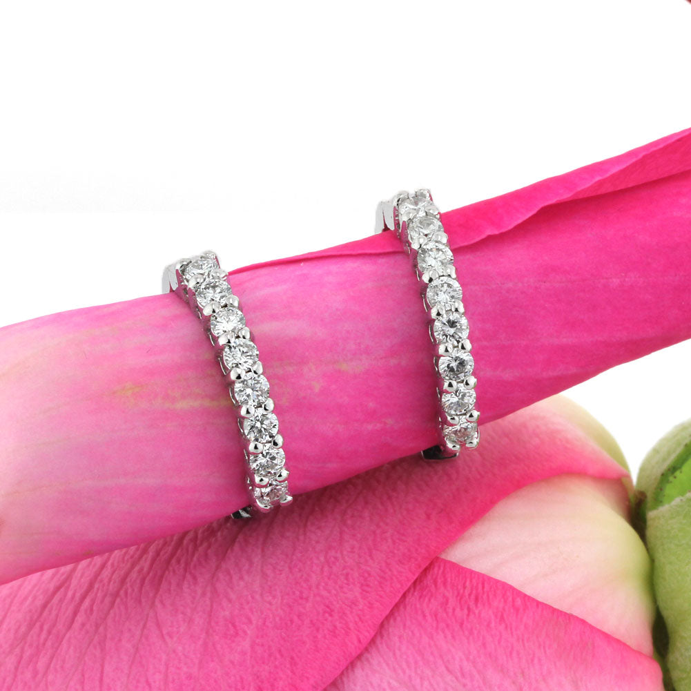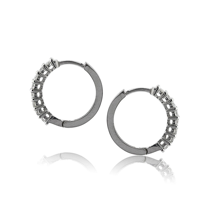 These diamond huggies are set with half a carat of round brilliant cut diamonds on high polish white gold. There are eight diamonds set on each earring in a beautiful shared prong design. They are absolutely stunning! A great gift for any occasion.