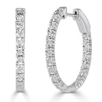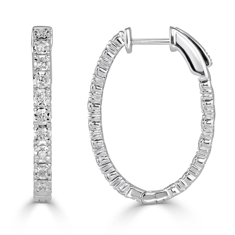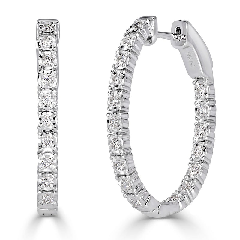 This lovely pair of diamond oval hoop earrings features 0.50ct of round brilliant cut diamonds graded at E-F colors, VS2-SI1 clarities. The diamonds are set on the outside as well as on the inside of these 14k white gold earrings.