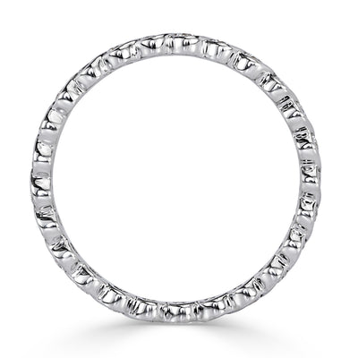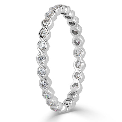 Round brilliant cut diamonds dance across your finger in this amazing eternity band. Half of a carat of colorless, clear round brilliant cut diamonds dazzle in this delicate design. The platinum bezel twists itself around each diamond perfectly showcasing their splendor. It is subtle enough to be worn in a stack and sensational as a stand-alone piece. This ring is sure to be loved.