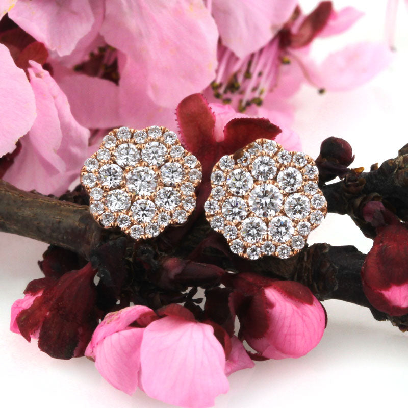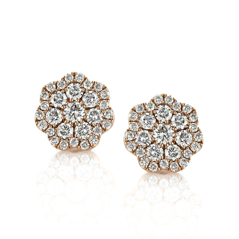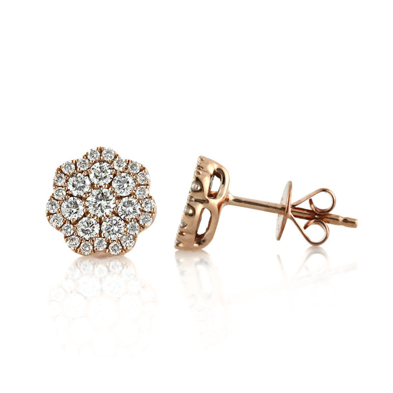 Rose gold and diamonds make for an amazing combination on this lovely pair of diamond cluster stud earrings. The studs feature 0.55ct of bright round brilliant cut diamonds set in a pavé style on 14k rose gold. The flower shape of the studs exude a very feminine feel, perfect for any occasion.