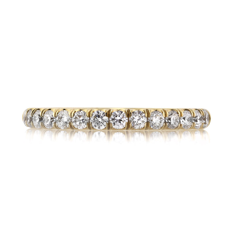 Here is a gorgeous round brilliant cut diamond band that has an incredible presence on the hand. This deliciously beautiful 0.55ct round brilliant diamond and 14k yellow gold band is nice and thick affording large diamonds and a rich look.