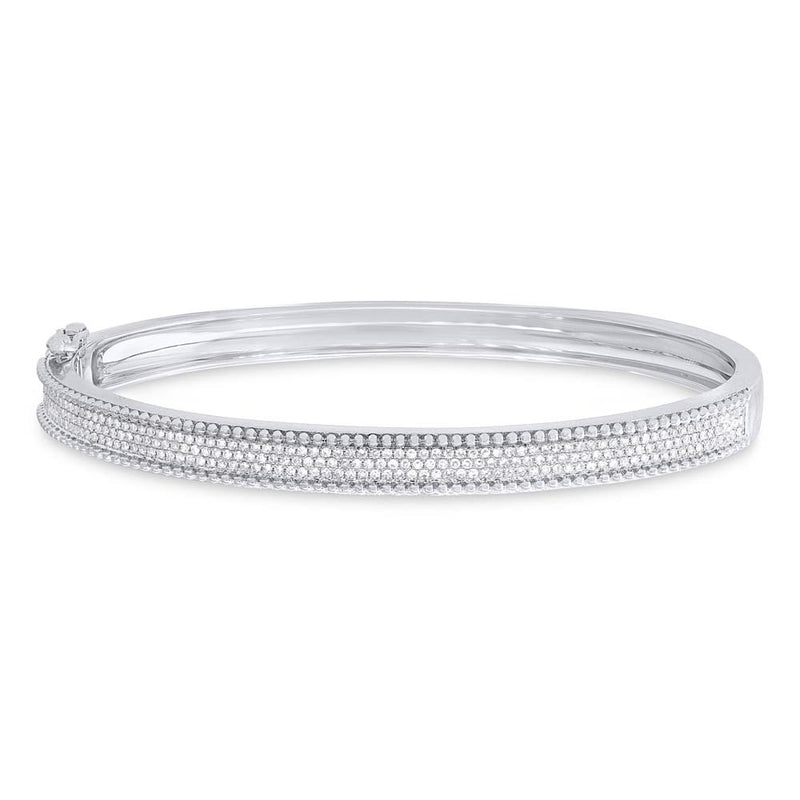 This stunning bangle features 0.59ct of dazzling round brilliant cut diamonds going halfway across, embodied by a high polish beaded edging. The diamonds are certified at E-F, VS2-SI1 gradings and are beautifully set against the 14k white gold setting.