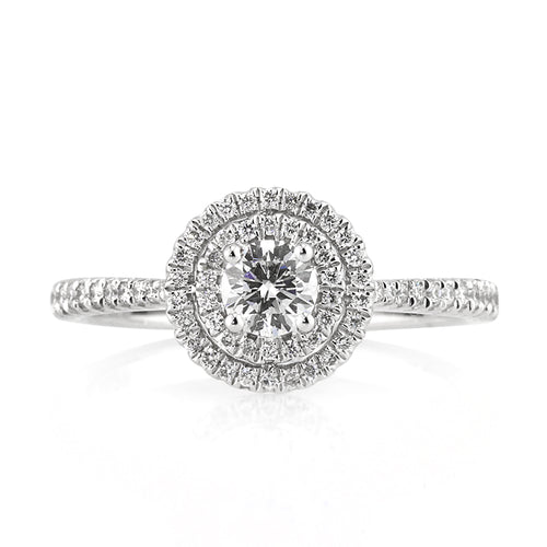 This stunning round brilliant cut diamond engagement ring has such a great design and gives you great value! The beautiful round center diamond is surrounded by a double halo of round diamonds in a micropave setting. The shank is gorgeous and graduates thinner as it gets to the center. The diamonds stand out beautifully with minimal metal showing. You will love it!