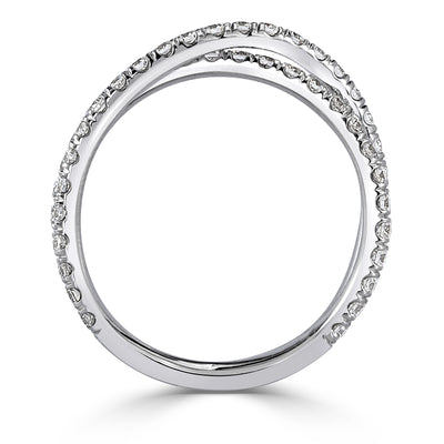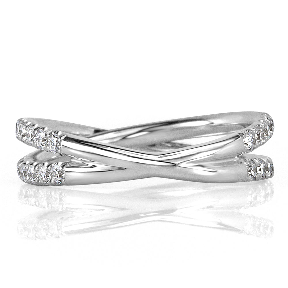 This lovely wedding band is designed to fit perfectly with a solitaire style engagement ring or as an exquisite stand-alone piece. The two dainty bands of micro pave set diamonds sparkle tremendously as one row crosses the other. Visually captivating and starring 0.85ct of round brilliant cut diamonds set in 18k gold or platinum, you can barely look away from this timeless beauty!