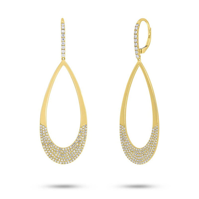 This lovely pair of pear shaped hoops are set with 0.88 carats of round cut diamonds on 14k yellow gold. It is 2.25” x 0.75”.