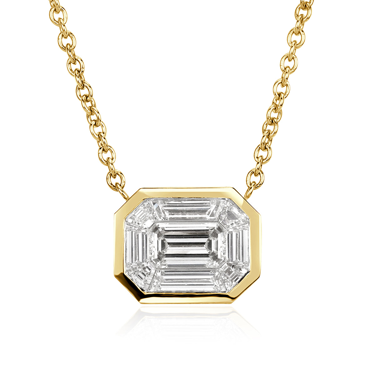 0.90ct Emerald and Trapezoid Cut Mosaic Diamond Pendant in 14k Yellow Gold