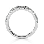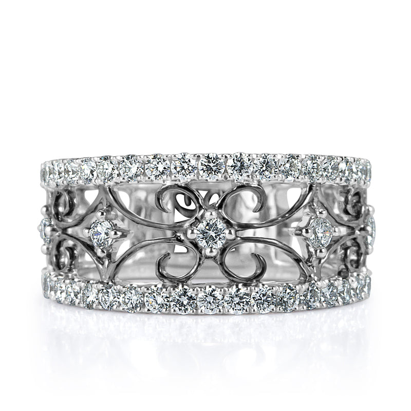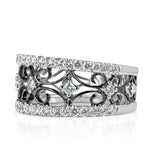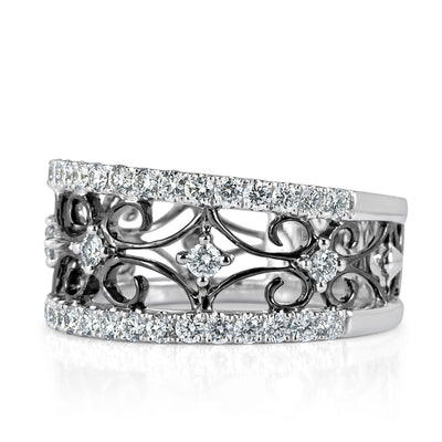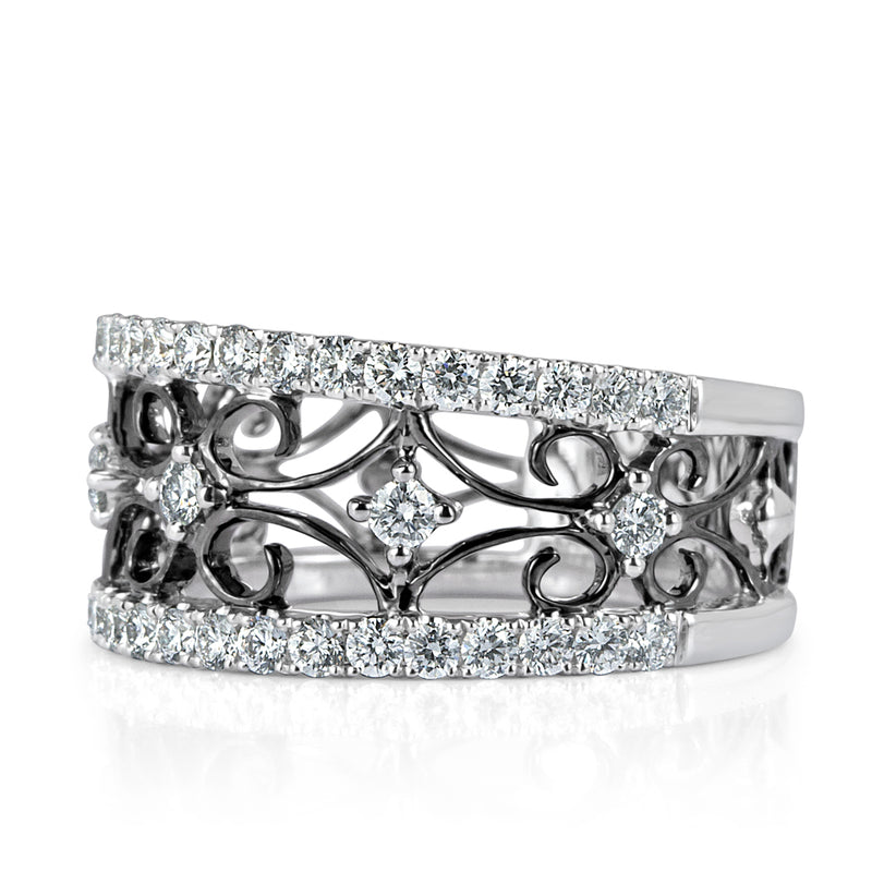 Black rhodium and white diamonds contrast well in this bold right-hand ring. The wide band is set with 0.90ct round brilliant cut diamonds on 14k white gold. At the center of the ring are single round brilliant cut diamonds set to halfway and two rows of micro pavé diamonds line the edges.
