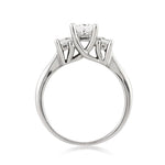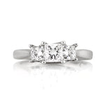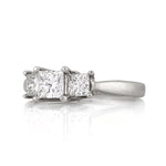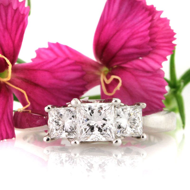 This exceptional princess cut three-stone engagement ring is set with very high quality diamonds on high polish 18k white gold. The diamonds match perfectly in cut and they are super brilliant! The diamonds are all certified through IGI (one of the leaders in diamond grading). The center diamond is certified at F-VVS2, exceptionally white and practically flawless. The side diamonds are graded at D-VVS2 and D-VS2, extra white and perfectly clear! All of the diamonds are certified at Excellent cut! You will love the quality and brilliance of this princess cut diamond ring! It is amazing!