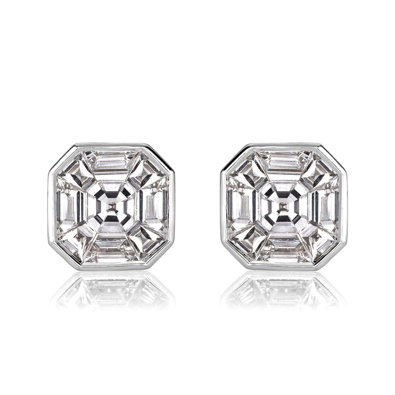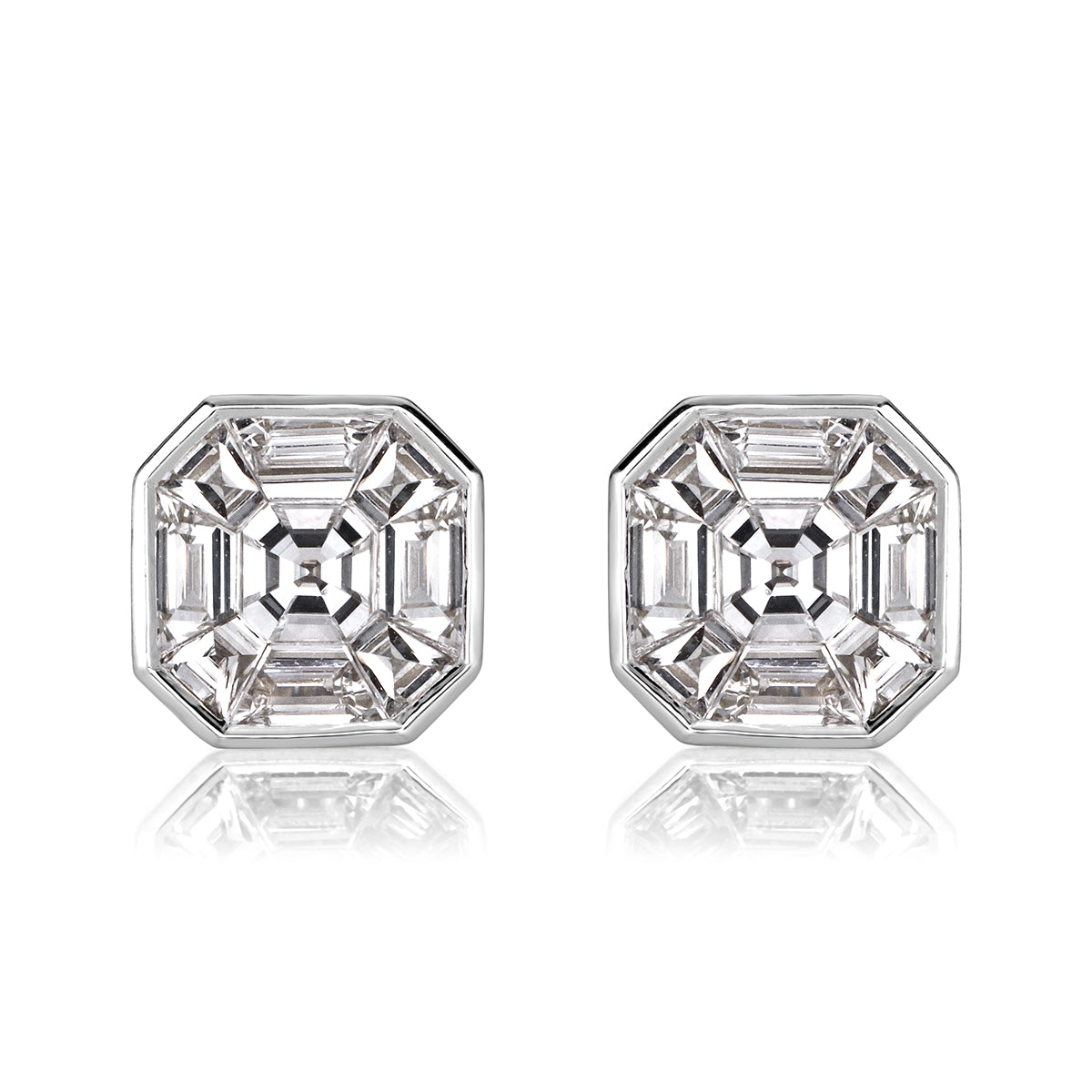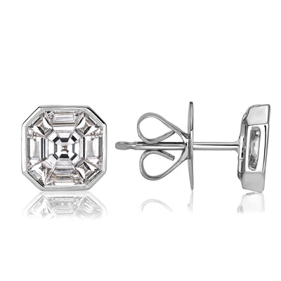 1.00ct Asscher Cut Mosaic Diamond Stud Earrings in 18K White Gold