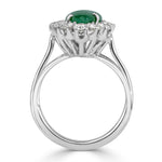 This diamond and jade ring is gorgeous and regal. The elongated jade cabochon set in the center is adorned with a halo of sparkling round brilliant cut diamonds that help to enhance the royal deep green of the jade. The 1.00ct diamond halo features F-G colored, VS1-VS2 clarity diamonds. This piece is not only beautiful but also rare. It is an estate piece that dates back circa 1969 and it has the original engraving inside. Set on a high polish 18k white gold split shank setting, this piece of artwork is unique and extraordinarily elegant.