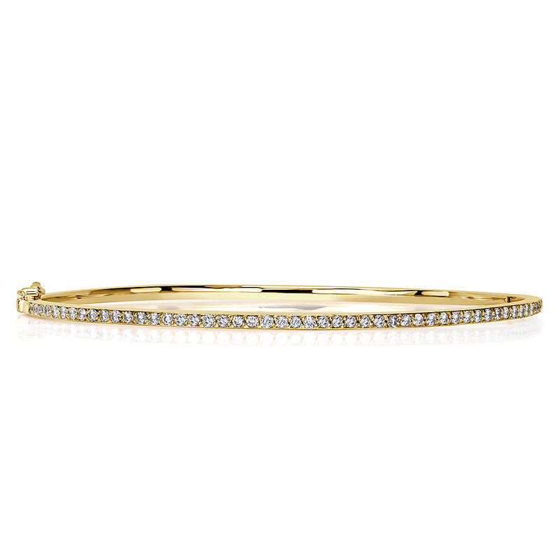 This diamond bangle bracelet is gorgeous! It showcases one row of bright sparkling round brilliant cut diamonds pavé set along the front of the bracelet. Expertly created in high polish 14k gold featuring 1.00ct of diamonds this piece is elegant simplicity at its finest.