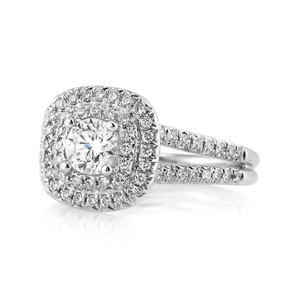 This stunning round cut diamond engagement ring embraces the elegant combination of a round center diamond with a cushion halo. The half a carat round brilliant cut center diamond is accented by a double halo of round diamonds. The split shank is also set with two rows of round diamonds. They are all set in a micropave setting showcasing them perfectly with minimal metal showing. A very beautiful and brilliant engagement ring at a great value!
