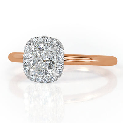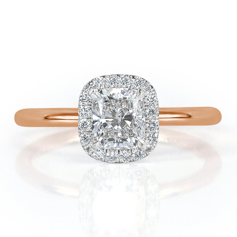 This cushion cut diamond engagement ring has stunning simplicity. The dazzling 0.91ct gem is GIA certified at E-VS1, a high quality combination. It faces up colorless and the cut is magnificent. It is surrounded by a brilliant micro pavé halo of round diamonds and the plain band is created in high polish 18k rose gold.