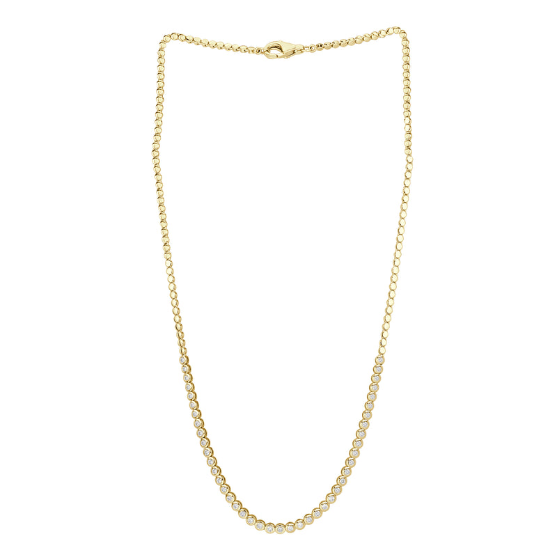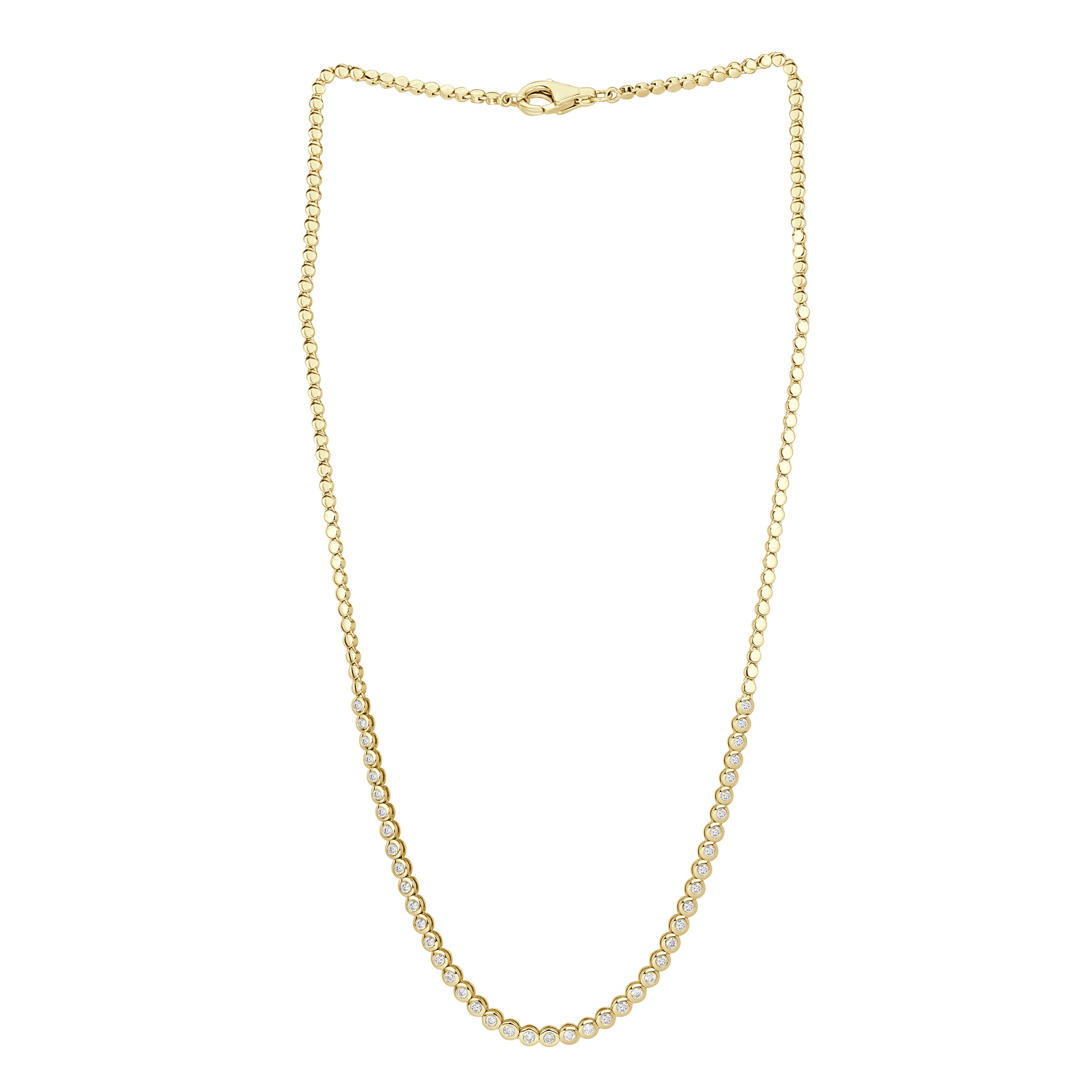 The 1.03-carat Round Brilliant Cut Diamond Bezel Set Tennis Necklace brings a modern edge to a jewelry classic. Handcrafted in your choice of 14K yellow or white gold, this design features natural round brilliant diamonds, each graded G-H in color and VS2-SI1 in clarity, fully framed in polished bezels that highlight their sparkle and give the piece a smooth, contemporary finish.