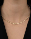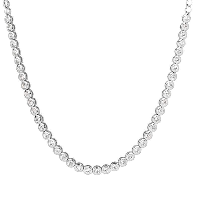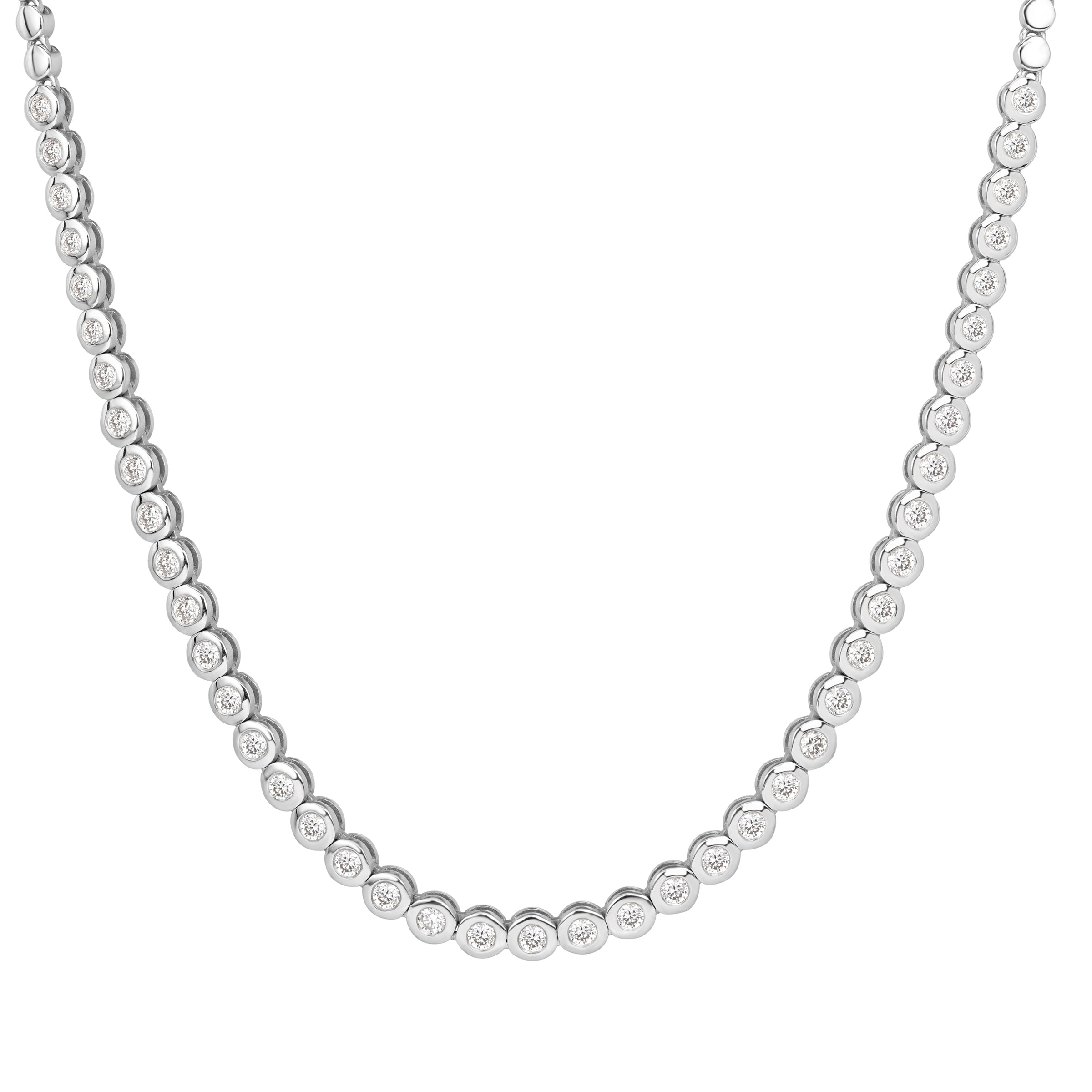 With diamonds set continuously around the neckline, this necklace captures the timeless appeal of the tennis style while offering the comfort and security of bezel settings. The sleek bezels not only protect the stones but also create a refined silhouette that drapes gracefully against the skin.