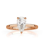This stunning diamond solitaire engagement ring was created with the classy lady in mind. This design showcases a lovely 1.00ct pear shaped cente diamond that is GIA certified at J-VVS2, facing up a beautiful white and nearly flawless in clarity. This beauty has an incredible cut allowing it to glimmer very brilliantly and is also graded in excellence for polish and symmetry. It measures at 9.10 x 5.45mm and faces up more like a 1.25ct diamond! It is set on a classic 18k rose gold solitaire setting with round brilliant cut side diamond accents on the hidden halo design for additional sparkle. This mesmerizing pear shaped diamond engagement ring is perfect as a stand-alone piece or styled with signature Mark Broumand wedding bands!