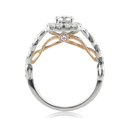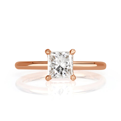 Solitaire engagement rings are a statement of classic simplicity and so is the case with this incredible princess cut diamond ring. The 1.01ct center diamond is GIA certified at M-SI1. The white of this beauty truly pops against the warm hues of the 18k rose  Perched on a high polish rounded band, the basket is also styled with a shimmering hidden halo design! Make a beautiful statement of love with this amazing princess cut diamond engagement ring.