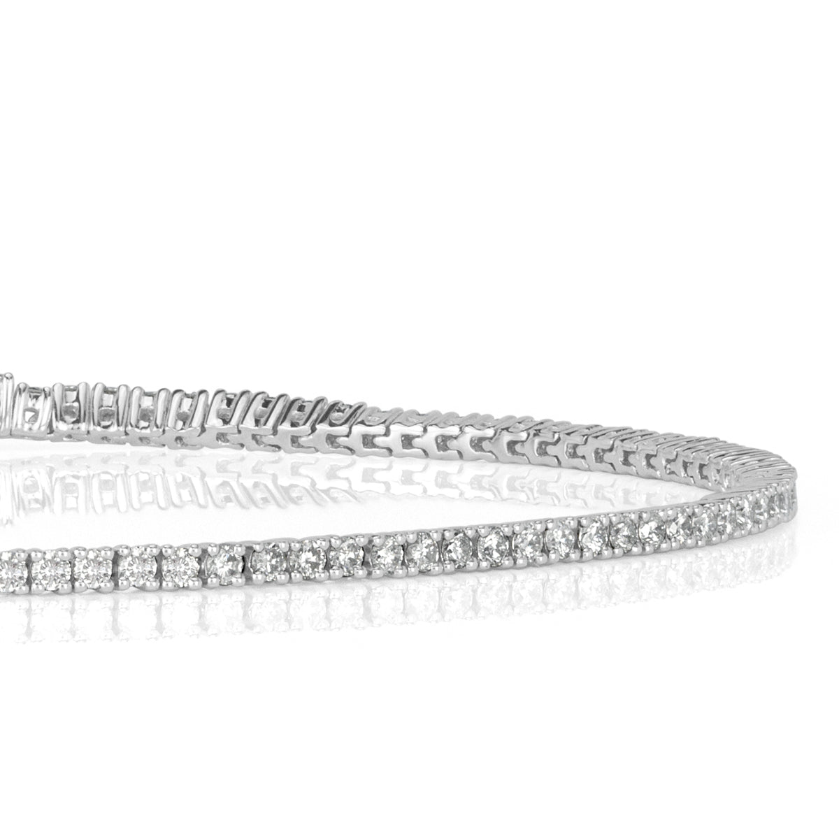 This diamond tennis bracelet is feminine and perfect for sprucing up any outfit. 1.16ct of shimmering round brilliant cut diamonds lay beautifully across the wrist with fluid movement due to the design and craftsmanship of this piece. Set in a high polish 14k white gold.