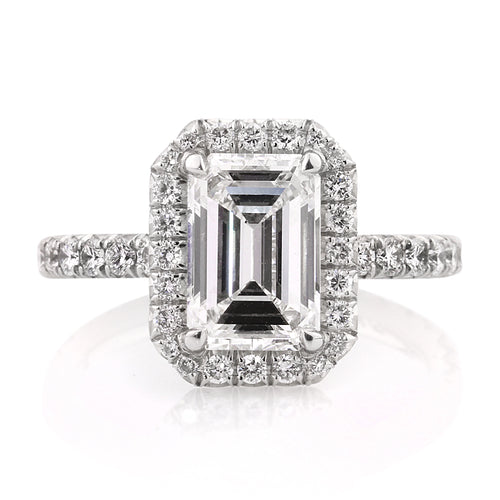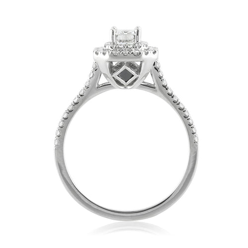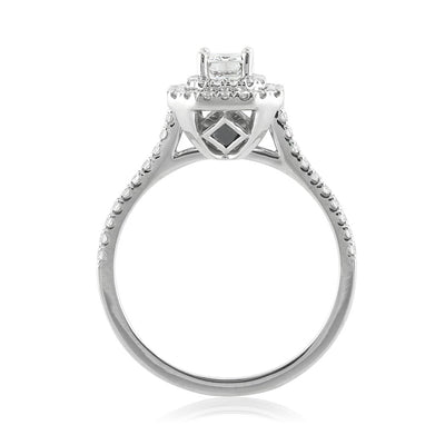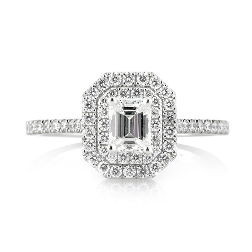 Enjoy the compliments that will be coming with this emerald cut diamond engagement ring. The exquisite 0.51ct emerald cut center diamond extremely white and super clean. It is set in a double halo of micro pavé round diamonds and is further accented by a row of diamonds on the 18k white gold shank. This emerald beauty will mesmerize you!