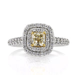 This stunning fancy light yellow cushion cut diamond engagement ring will thrill you from every angle. The beautiful light yellow center diamond sparkles tremendously! It is accented by a double halo of round diamonds and a row of round diamonds set down the shank in a micropave setting. The diamonds are all very clear and beautiful. They stand out beautifully. The design is outstanding! It sits on the finger very comfortably and looks amazing! Get ready for the compliments!