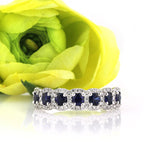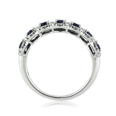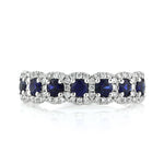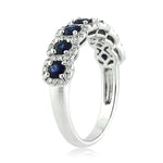Sapphire and diamonds are an exquisite combination in this lovely right-hand band. The fine ring is set with 0.84ct of round cut sapphires prong set on 14k white gold. Each sapphire is encompassed by a halo of micropave set brilliant round diamonds. This sapphire and diamond band will be your every day ring!