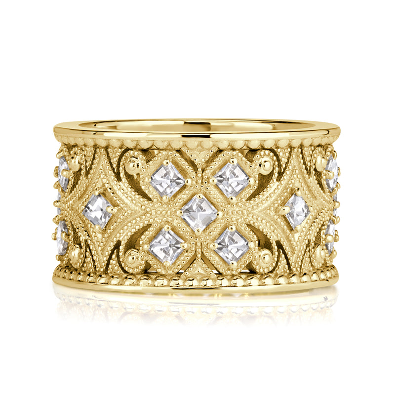 The 1.21ct Pixel Cut Diamond Milgrain Cigar Band combines the bold elegance of a cigar band with the delicate artistry of pixel-cut diamonds. Featuring 1.21 carats of meticulously set G-H color and VS1-VS2 clarity diamonds framed by intricate milgrain detailing, this ring exudes timeless sophistication. Crafted from luxurious 18k gold, it's the perfect ring for those seeking a statement piece with vintage flair. Whether worn as a wedding band or showcased on its own, this ring represents refined taste and unparalleled craftsmanship. Ideal for those who appreciate classic elegance with a modern twist.