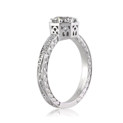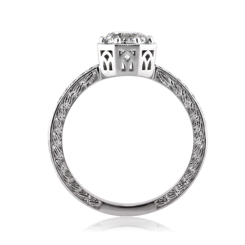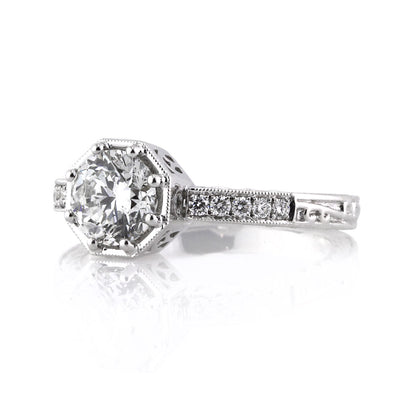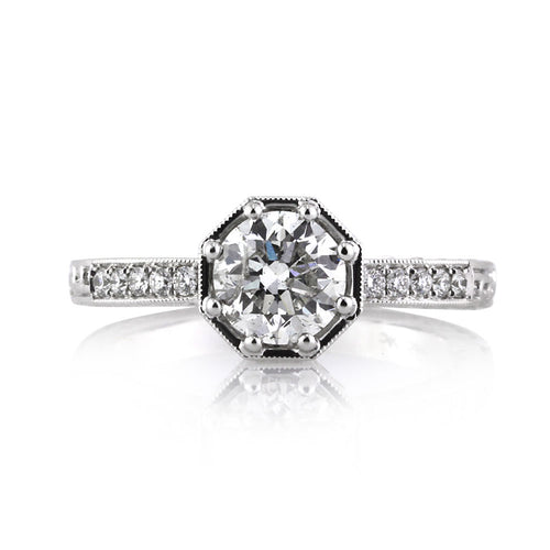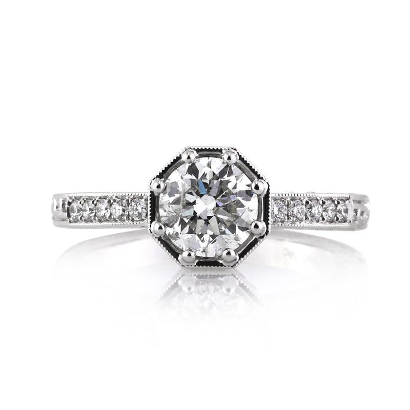 The vintage flair of this round brilliant cut center diamond is prominent from every angle. The one carat center stone is set in a very unique eight-prong setting style shaped octagonally. The shank is pavé set with round diamonds and showcases beautiful detail work. The center basket features a lovely cut out design. Enjoy classic, vintage style with this round brilliant cut diamond ring.