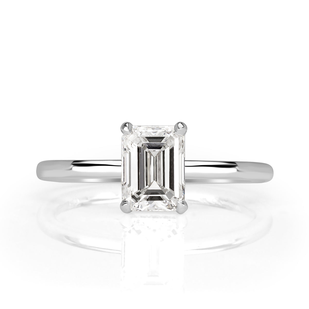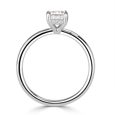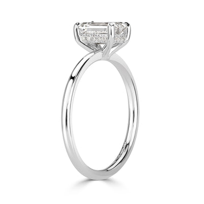 Handcrafted from top to bottom, this emerald cut diamond engagement ring is exceptionally timeless. The classic design of this 18k white gold, high polished setting displays the center diamond with maximum sophistication. The centerpiece showcases an incredible 1.15ct emerald cut diamond GIA certified at E-VS1. This beauty faces up colorless and is super clear. It measures at an amazing proportion of 6.96 x 5.14 mm. For additional sparkle, smaller round brilliant cut diamonds are set on the hidden halo of the ring's basket. This gorgeous emerald cut diamond engagement ring will absolutely stun her!