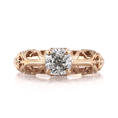 With a simple glance, the beauty and elegance of this rose gold cushion cut diamond engagement ring is quite apparent. This gorgeous masterpiece features a beautiful 1.03ct cushion cut center diamond EGL certified at F-SI2. It is set on a feminine flowing designer setting complete with lovely scrolls and round accent diamonds. Milgrain detail is prevalent throughout as well. The incredible cushion cut diamond ring is created in high polish 18k rose gold with superior craftsmanship to last a lifetime.