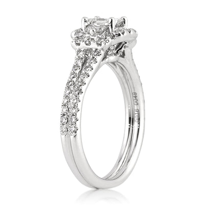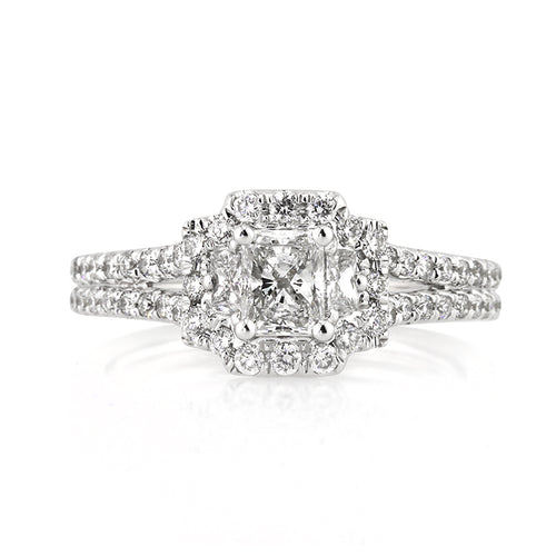 This masterfully designed radiant cut diamond engagement ring has such an outstanding combination at a great value! The beautiful half a carat center diamond is accented by two brilliant cut trapezoids with a halo of round diamonds set around them. The split shank is set with two rows of round diamonds. The ring is all set in a micropave design showcasing all the diamonds perfectly with minimal metal showing. There are diamonds set on the center connectors as well for an added touch of brilliance. Gorgeous from every angle!