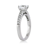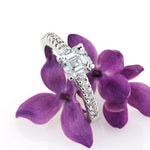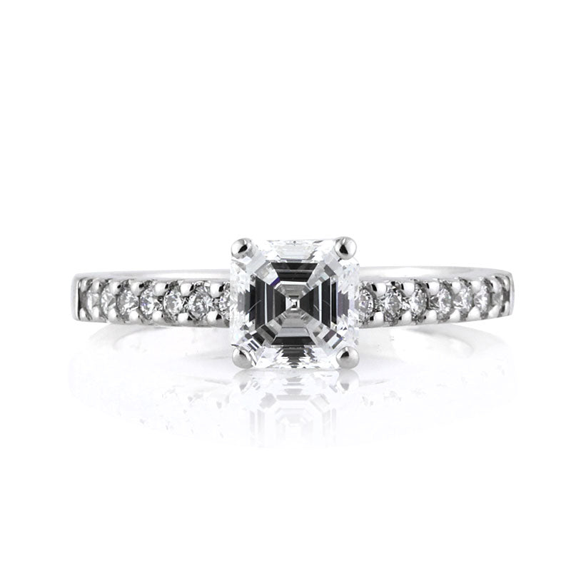 Asscher cuts are extraordinarily beautiful and this one is no exception. The 1.01ct Asscher cut poised in the center of this engagement ring is GIA certified at D-SI1, colorless and eye clean. This handpicked one carat center stone has a phenomenal cut allowing it to shine very brilliantly. It is set on an exquisite platinum setting accented by round brilliant cut diamonds pavé set on either side going down halfway. This elegant, handcrafted Asscher cut diamond ring will absolutely stun her!