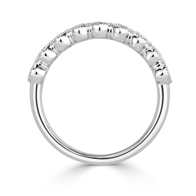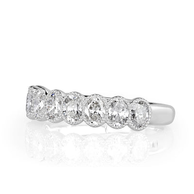 Seal the cherished moment of marriage vows with this lovely 18k white gold diamond wedding band. Mark Broumand never compromises when it comes to diamond selection and each of the diamonds in this band consist of premium qualities. The oval cut diamonds display shimmering brilliance due to their premium colors of E-F and VVS2-VS1 clarities. Each stone is adorned with a dainty milgrain etching around it, which truly allows the diamonds to pop. This piece of artwork is a unique and beautiful take on a wedding band.