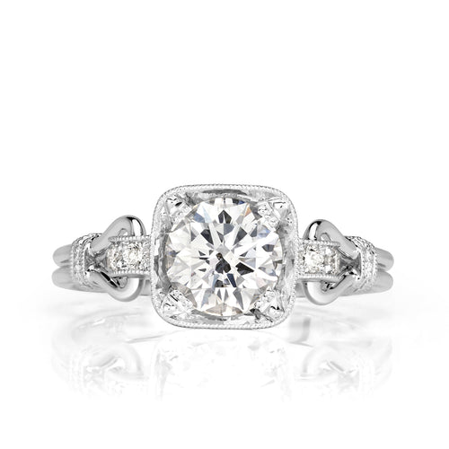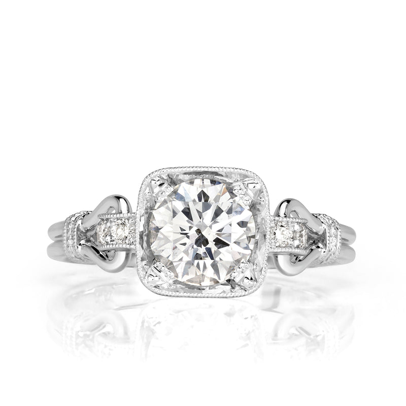 This round brilliant cut diamond engagement ring is unique and extremely flattering on the finger. The sparkler perched in the center is a stunning 1.14ct round brilliant cut diamond that is EGL ceritified at G-SI2. This beauty faces up a bright white, is perfectly eye-clean and is graded in excellence for cut, polish and symmetry. It dazzles with tremendous fire. The centerpiece is showcased in a cushion shaped basket with shimmering round brilliant cut diamonds adorned on each side. The luxurious platinum shank is handcrafted in a double band design that loops and connects to the top portion of the milgrain accented basket. Dare to be different with this incredible round brilliant cut diamond engagement ring!