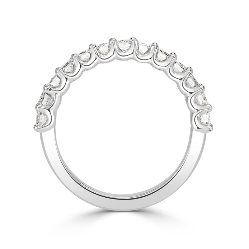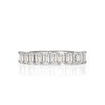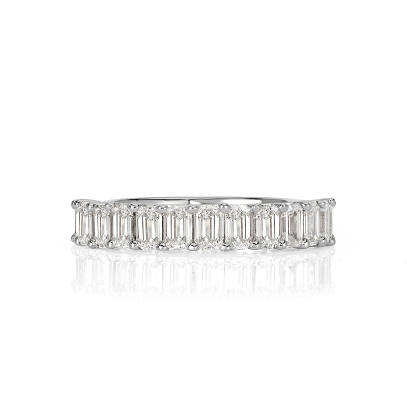 This simple and chic emerald cut diamond eternity band is a stunning addition for your daily wear! The ring features 1.28ct of perfectly matched emerald cut diamonds that are hand set next to one another in a high polish 18k white gold setting. The ”U” prongs showcase the diamonds beautifully with minimal metal showing. A perfect statement look or to pair with your engagement ring!