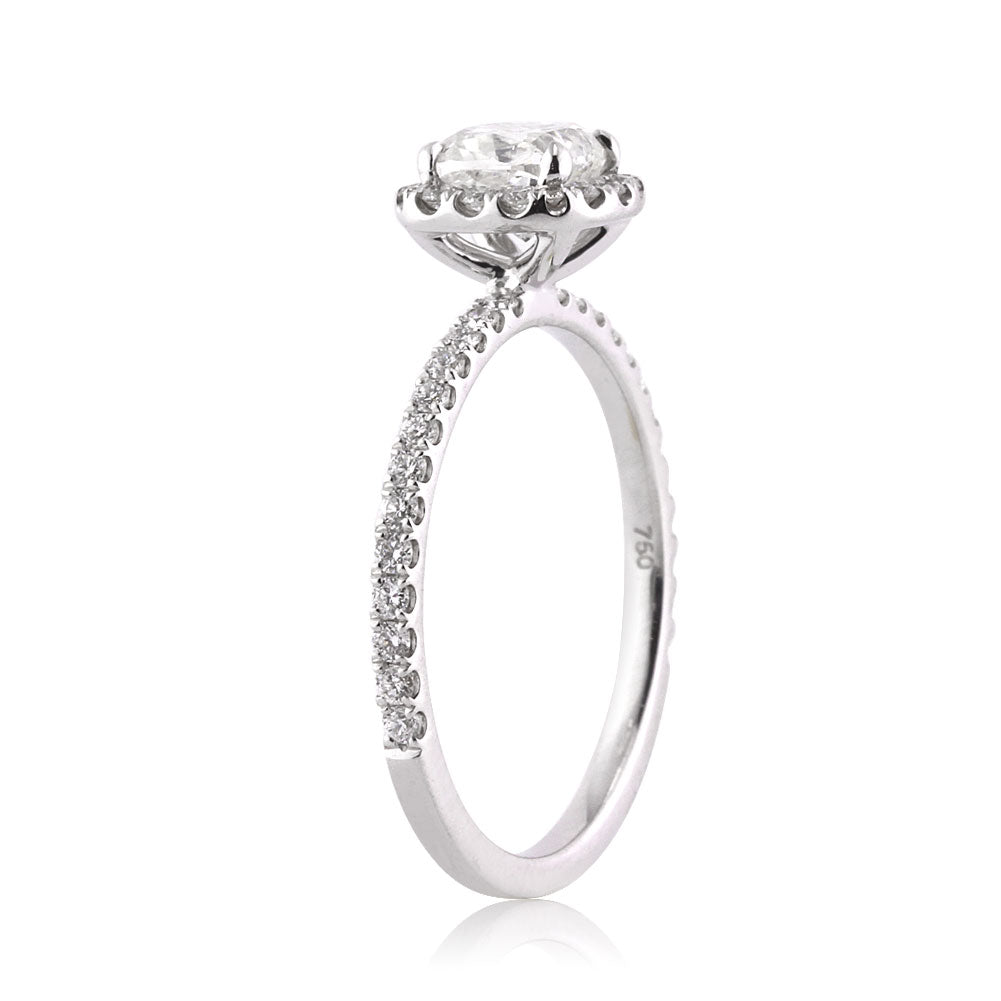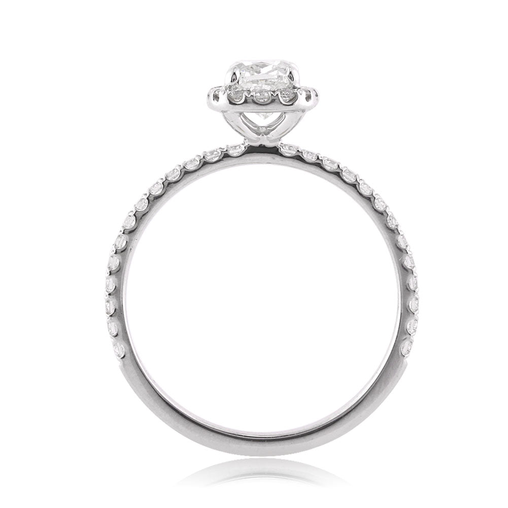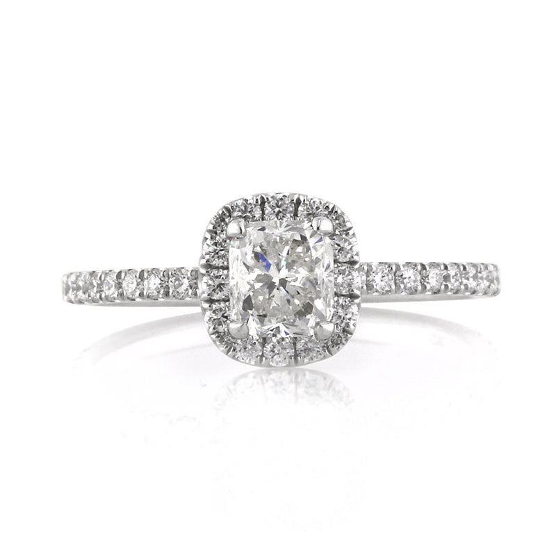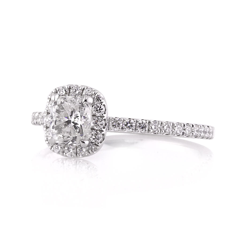 Spectacular design, lasting comfort, and unparalleled quality--this cushion cut diamond engagement ring has it all. The enchanting 0.74ct cushion cut diamond poised in the center is certified at G-SI2. It is appears a nice white and has a very pleasing shape. The dainty design is well thought out and created in a manner so that a matching band could be worn flush with the engagement ring for a nice uniform look. The brilliant three-quarter carat cushion cut center diamond is set at the center of a custom-made, halo, micro pavé setting in 18k white gold. It wears comfortably and was quality crafted by a master jeweler to last a lifetime.