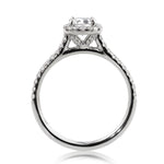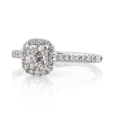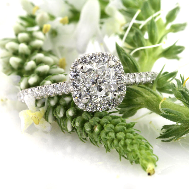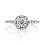 This stunning cushion cut diamond engagement ring has such a amazing combination at a great price! The 0.70ct cushion cut diamond set in the center is GIA certified (one of the leaders in diamond grading) at F-VS1, exceptionally white and perfectly clear, even under 10X magnification! It is set on a custom made platinum setting featuring a halo of round diamonds and a row of round diamonds set down the shank. The center connectors are also studded with round diamonds. This design will allow for a band to sit flush with it as well. Amazing from every angle! You will love it!