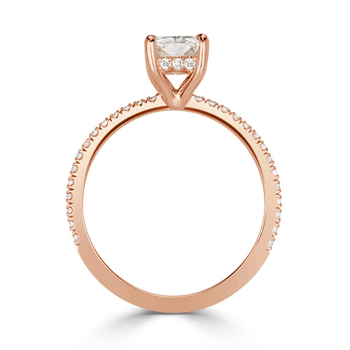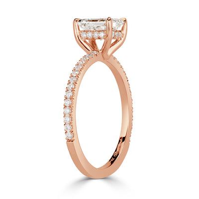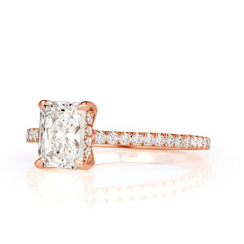 Rose gold and radiant cut diamonds make for the perfect pairing on this beautiful diamond engagement ring. The rich, 18k rose gold designer setting showcases a remarkable 1.01ct radiant cut center diamond GIA certified at H-SI1. It faces up a shimmering white and is graded in excellence for polish and symmetry. This stunner measures at an incredible proportion of 6.84 x 5.26 mm. The diamond's cut is crisp, allowing for much brilliance and sparkle whilst perched atop this dream setting. Dazzling round brilliant cut diamonds are pavé set down the dainty shank. For additional sparkle, you can find more diamonds set into the hidden halo design. Melt her heart and seal your love with this fabulous radiant cut diamond engagement ring!