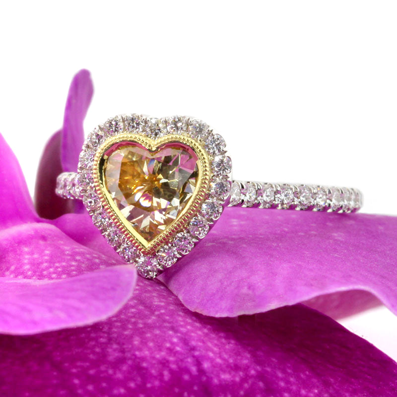 This mesmerizing fancy yellow heart shaped diamond ring gives you an outstanding combination at an excellent value! The spectacular 0.55ct heart shaped diamond set in the center is GIA certified (one of the leaders in diamond grading) at Fancy Light Yellow SI2. It has a very divine fancy yellow color and it is perfectly eye clean! The inclusion is a small white feather on the side of the diamond that can hardly be seen under 10X magnification. The cut is so exceptionally beautiful. It actually looks like it is almost one carat in the center! It is bezel set in the center with milgraining all the way around it. There is a halo of round diamonds that accent it with a row of round diamonds set down the shank in a micropave setting which showcases the diamonds so beautifully with very little metal showing. It is dainty and elegant! The center basket is made in high polish 18k yellow gold and hand engraved throughout. The connectors are also studded with round diamonds for an added touch of brilliance from every angle! A heart shaped diamond ring you will cherish forever!