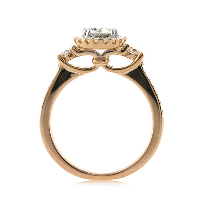 This round cut diamond engagement rings gives you an outstanding combination of design, quality and beauty. The gorgeous 0.75ct round brilliant cut center diamond is GIA certified at G-VS1. It is white, perfectly loupe clean and the cut is mesmerizing. It is accented by a halo of round diamonds and flanked by two larger round diamonds in a prong setting. The shank is pave set with round diamonds and features milgrain detail as well. The unique center basket design is gorgeous as well. The great combination of exceptionally white diamonds on rose gold is so beautiful. You will cherish it forever.