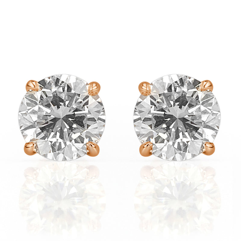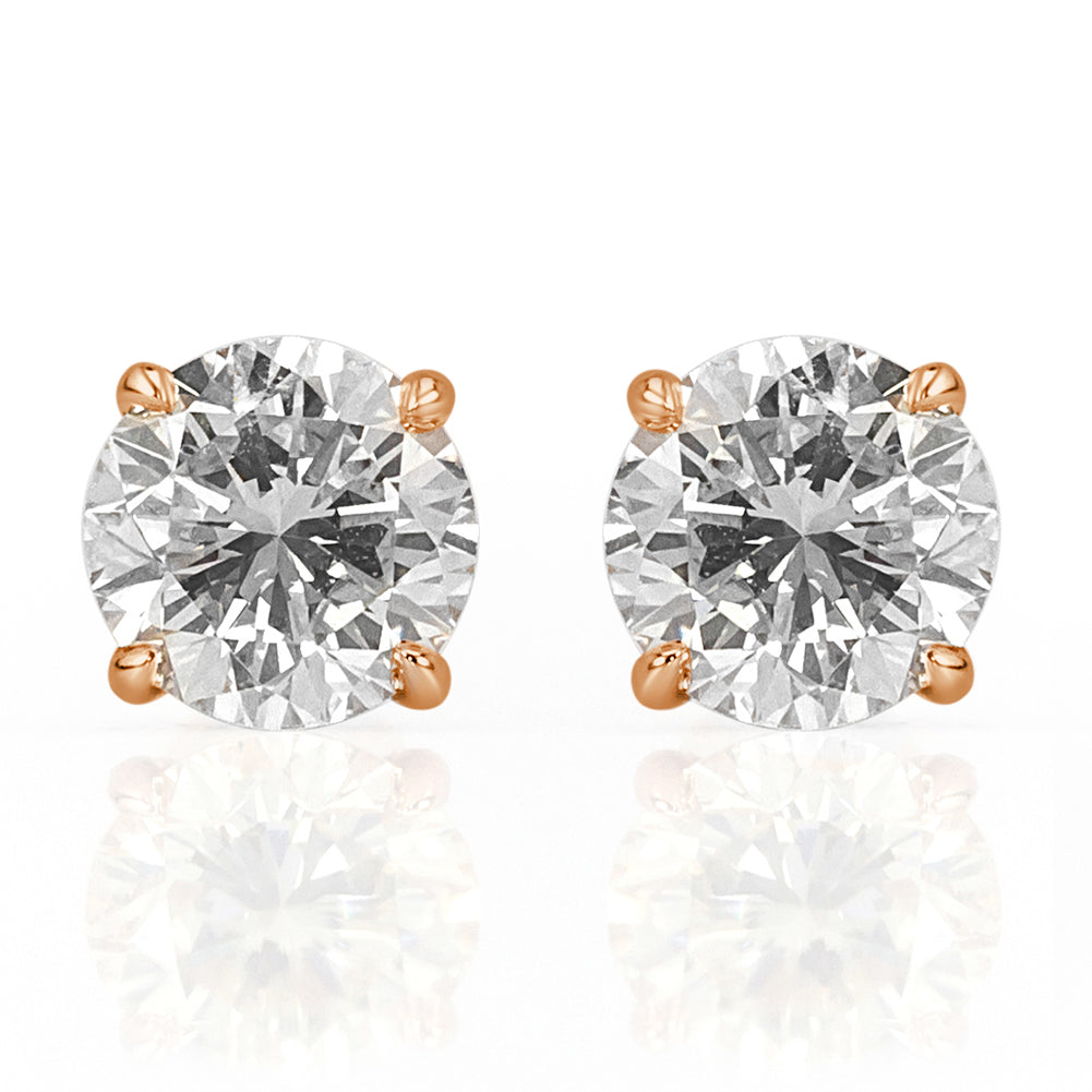 This pair of beautiful round brilliant cut diamond stud earrings are absolutely stunning and perfect for an everyday look. Set on a soft 14k rose gold setting, the diamonds weigh a total of 1.35ct and are GIA certified at I-VS2 with excellent grading in cut, polish and symmetry. The diamonds against the feminine hues of the rose gold metal truly allow the gems to pop! These are a must in every woman's jewerly box!