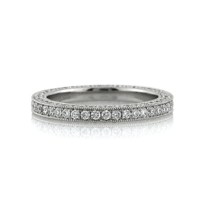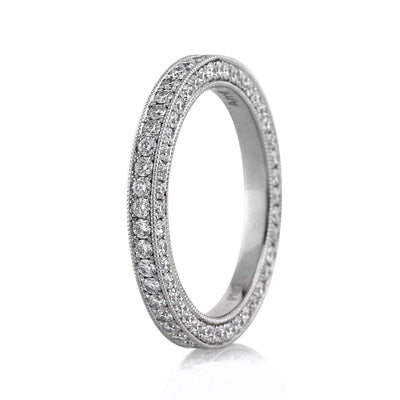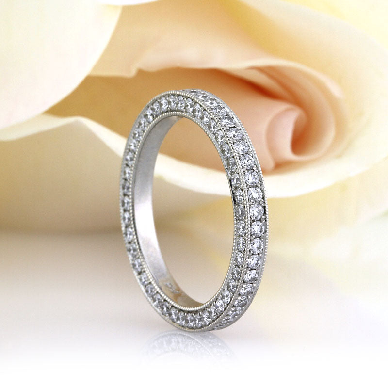 This exceptionally beautiful three sided pave diamond eternity band is super sparkly! This band features close to one and a half carats of sensational round diamonds, masterfully picked to match perfectly. They are pave set on all three sides in this platinum band and feature milgrain detail throughout. It is stunning as a compliment to your engagement ring or worn on its own!