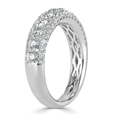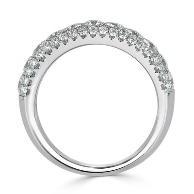 This stunning diamond wedding band features three rows of round brilliant cut diamonds french pave set to perfection on all three sides. It features larger diamonds on the top with each diamond hand selected for its combination of qualities. It is perfect as a stand alone piece or to match with a beautiful engagement ring. The craftmanship is outstanding!