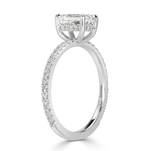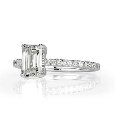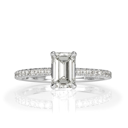 This truly remarkable emerald cut diamond engagement ring is jaw dropping! The 1.03ct center diamond is GIA certified at F-VS1. It faces up colorless and very clear. This beauty measures at an incredible proportion of 7.00 x 4.75 mm. The mesmerizing cut gives off tremendous brilliance! The centerpiece is accented by round, exceptionally white diamonds in the hidden halo and going down the shank in a high polished platinum ring setting. This sensational piece radiates with phenomenal fire, just like your love. It is the ultimate symbol of your love and devotion.