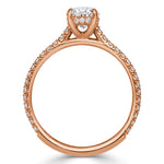 Everything about this spectacular oval cut diamond ring is amazing. The centerpiece features a beautiful 1.01ct oval cut center diamond GIA certified at J-VS2. It faces up a lovely white and is perfectly eye-clean. This beauty measures at 8.27 x 5.46 mm. The oval cut is handset in a gorgeous 18k rose gold setting with accents of shimmering round brilliant cut diamonds in a pave setting on the hidden halo design as well as going down the shank of the ring. This elegant oval cut diamond engagement ring makes an incredible statement on the hand!