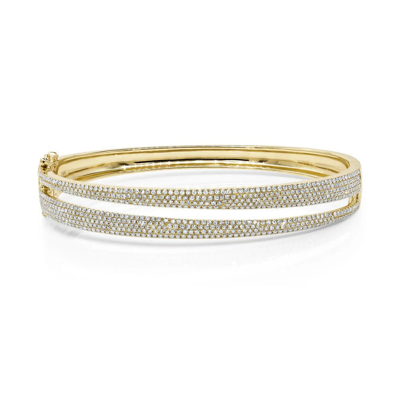 This stunning 14k rose gold diamond bangle has not only one but two shimmering rows of diamonds. It is beautifully set with round brilliant cut diamonds certified at E-F, VS2-SI1 gradings. This beauty is truly a showstopper!